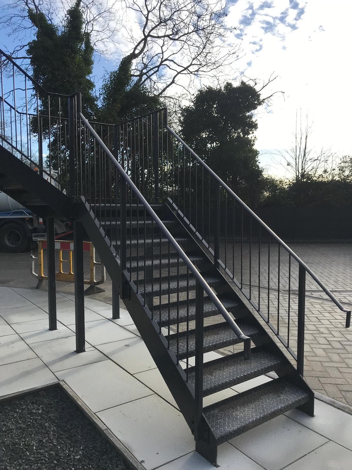 Contemporary mild steel exterior staircase with stainless steel handrails and structural glass balustrade.