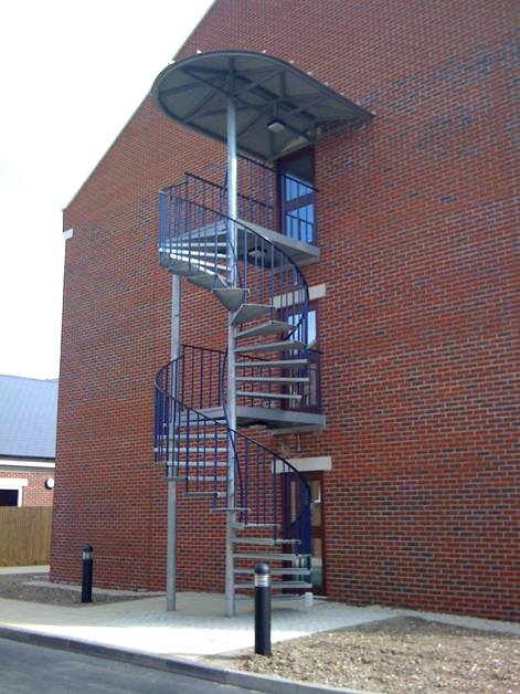 Galvanised spiral staircase with canopy to a new accommodation block in Portsmouth.