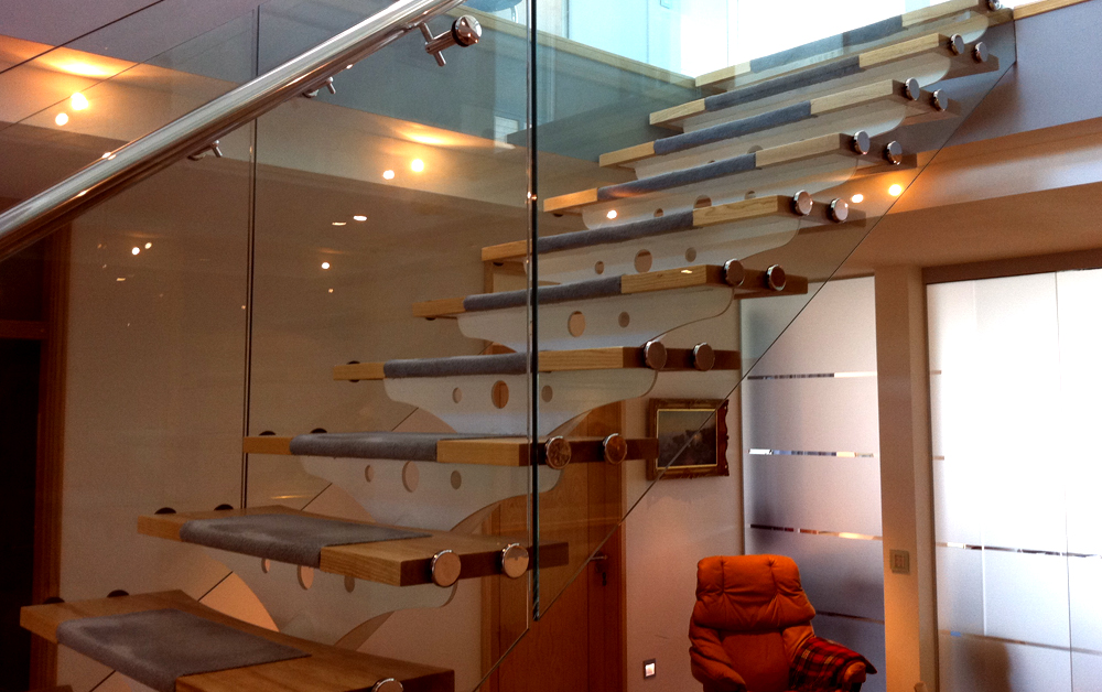Mild steel staircase, stainless steel balustrade with glass infills for a leading options in UK.